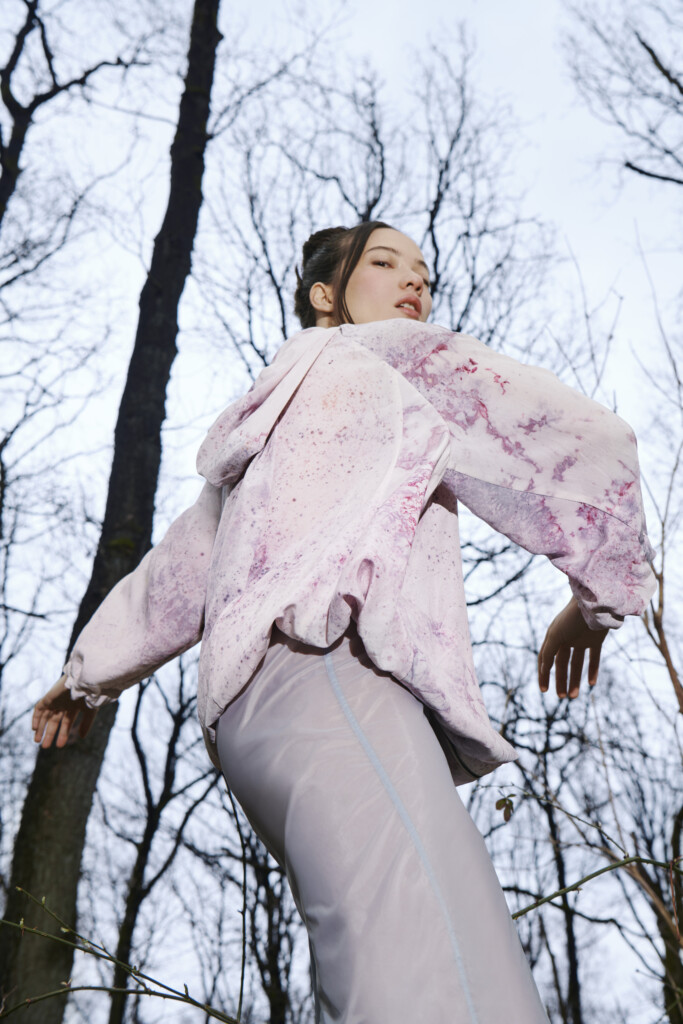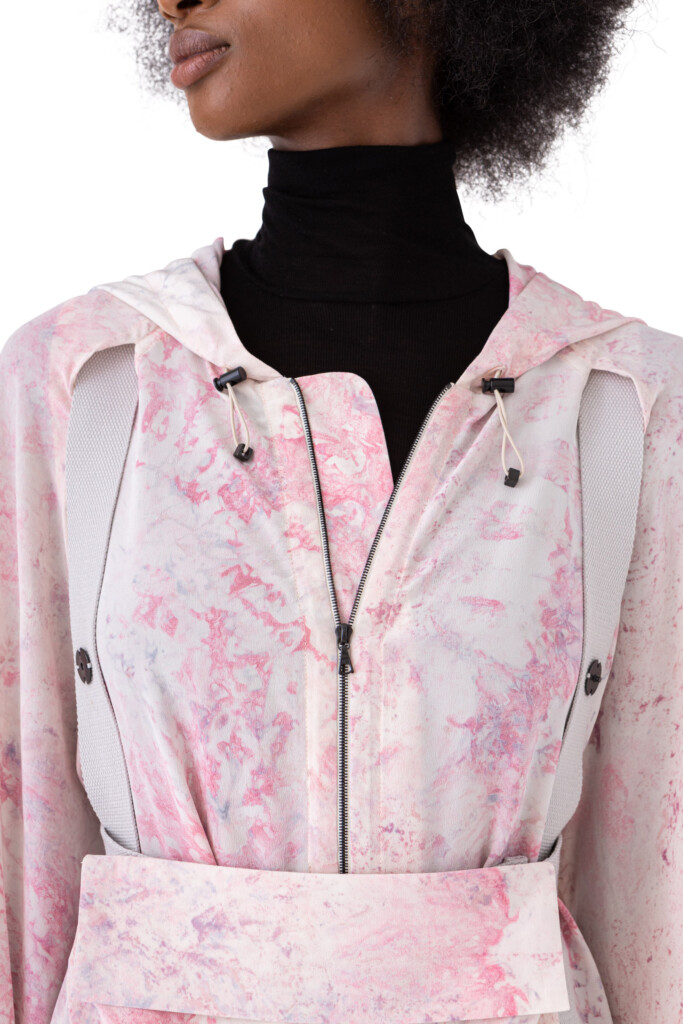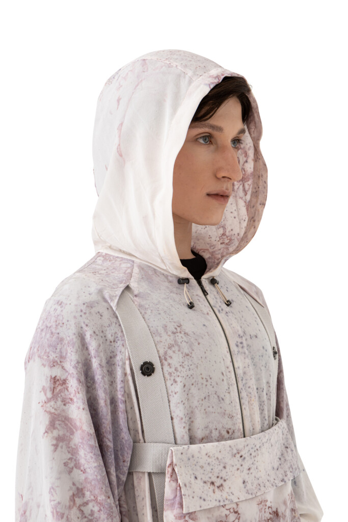 Cut from silk and batch dyed with wildtype Streptomyces Coelicolor, each Exploring Jacket is one-of-a-kind. This pigment-producing microbe creates bespoke patterns ranging from blue to red in colour. The current batch is mainly pink.