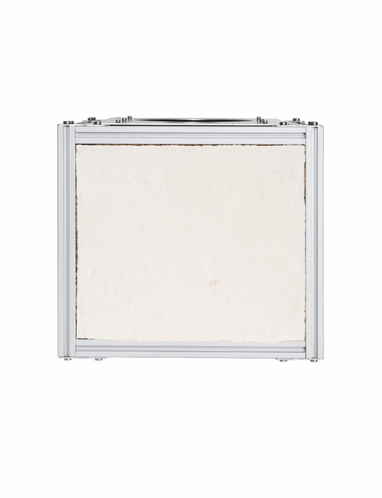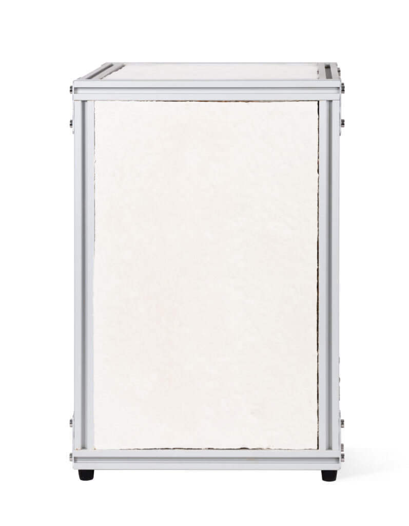 This unique pair of speakers has been crafted using in-house cultivated, home-compostable reishi mycelium, nourished by wood chips and sawdust waste from a local cabinet manufacturer. The recyclable aluminium structure supports the expansive fungal body, guiding its growth while allowing space for the organism to develop independently. The result is a one-of-a-kind sculpture—a product of human and mycelial collaboration. To enhance fungi’s regenerative potential, each speaker incorporates repairable drivers salvaged from discarded audio devices, reimagined within these living mycelium enclosures.