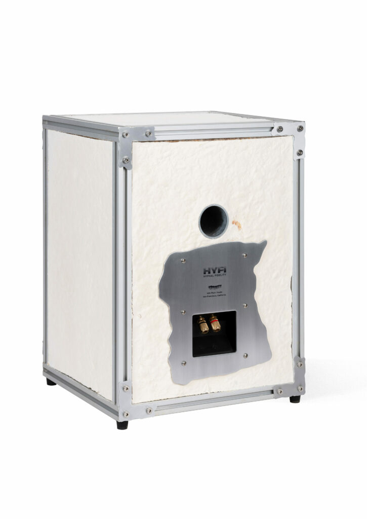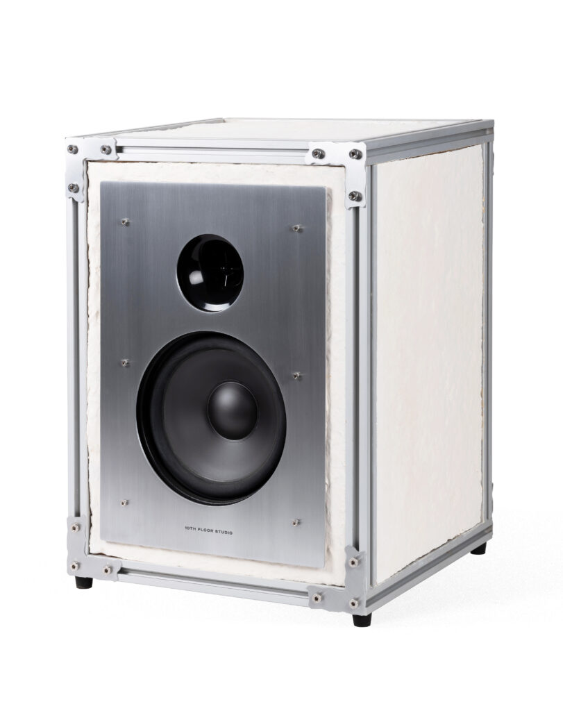 The speakers have been designed with in-house cultivated, home-compostable reishi mycelium, fed with wood chips and sawdust waste supplied from a local cabinet manufacturer.
