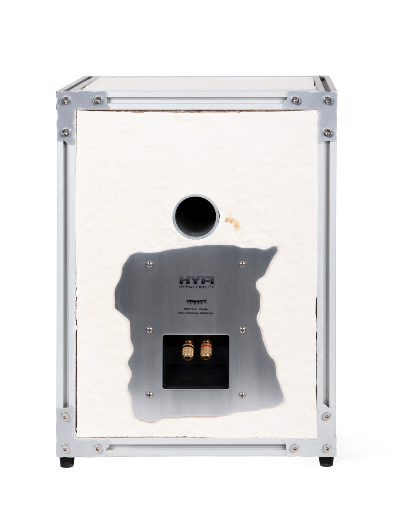 Reishi Mycelium (Ganoderma lucidum), Aluminium, Klipsch KG 1.2 Drivers. Includes “Sounds of Decomposition” audio track produced by Entropic (for 10th Floor Studio) for the custodian of Hyphal Fidelity Speakers – “As the shapes of objects around us evolve, how do we honour artefacts