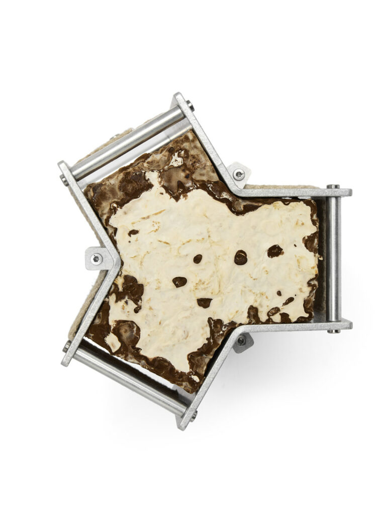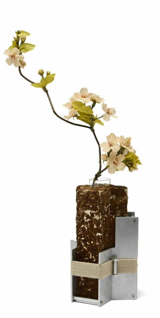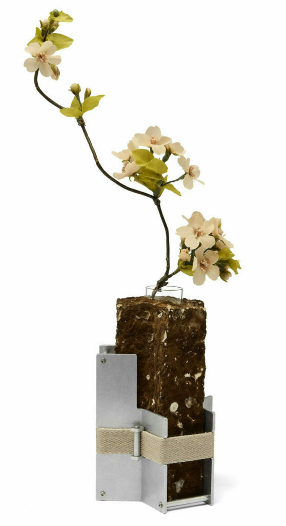 Shiitake mycelium, Aluminum, 175ml Borosilicate glass, Hemp webbing, Stainless steel fasteners. The mycelium has been dried and is inert. Keep in a dry environment. Remove dust with a feather duster or soft dry brush. Take care when handling the vase. Avoid dampening the Shiitake mycelium casing when refilling the vase with water.