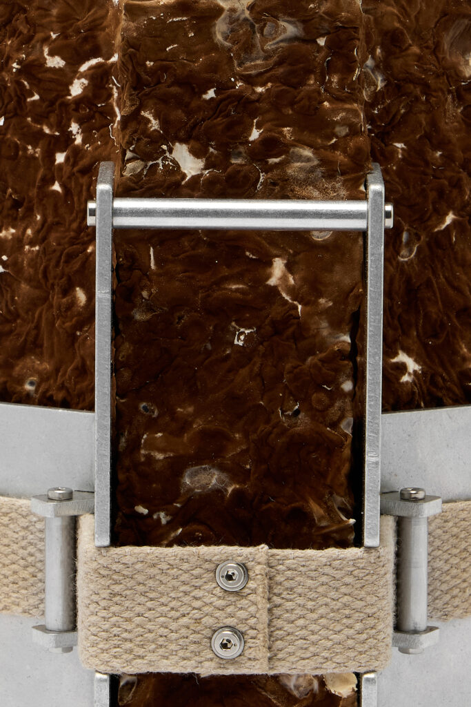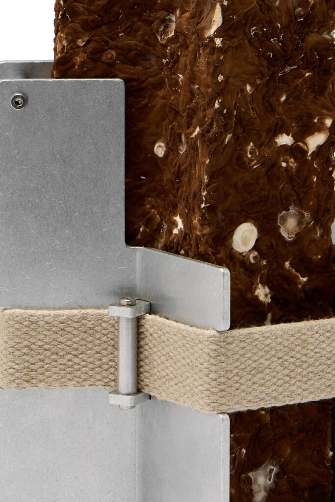 This small batch of bud vases is crafted with in-house cultivated, home-compostable Shiitake mycelium, which gradually develops its unique brown colour over the course of its growth. The recyclable anodised aluminium structure supports the fungal body, guiding its shape while leaving space for the organism to grow independently. A wax finish protects the aluminium from decomposition by the living material. The result is a unique art piece—a collaboration between human craftsmanship and mycelial growth.