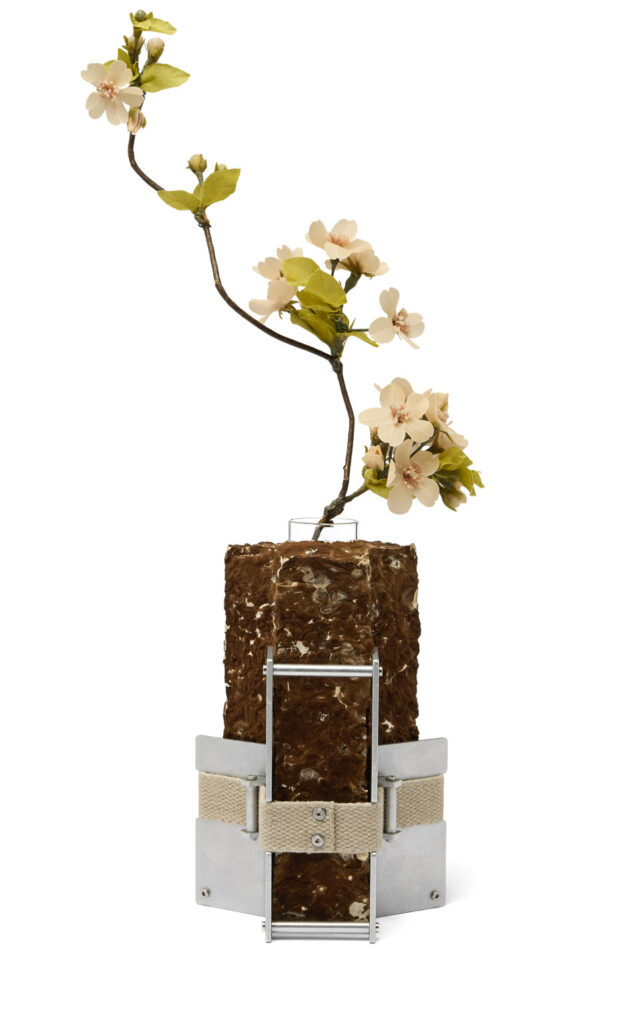 The Mycelium Bud Vase by 10th Floor Studio embodies nature’s interconnected cycles of growth, decay and renewal by integrating living mycelium into its design. Designed and cultivated in-house by 10th Floor Studio, the vase features recyclable aluminium plates bound by hemp webbing that protect and anchor the uniquely textured and coloured Shiitake mycelium body. A removable glass tube is nestled within the mycelial form, serving as a perfect vessel for freshly cut blooms*.